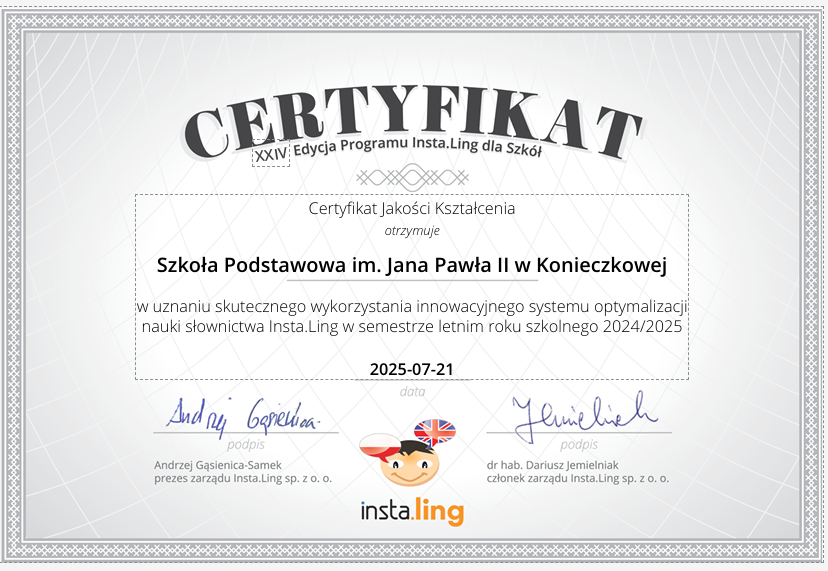 Miło nam poinformować, że otrzymaliśmy Certyfikat Jakości Kształcenia XXIV Edycji Programu Insta.Ling dla Szkół w uznaniu skutecznego wykorzystania innowacyjnego systemu optymalizacji nauki słownictwa w semestrze letnim roku szkolnego 2024/2025 z języka angielskiego i niemieckiego.